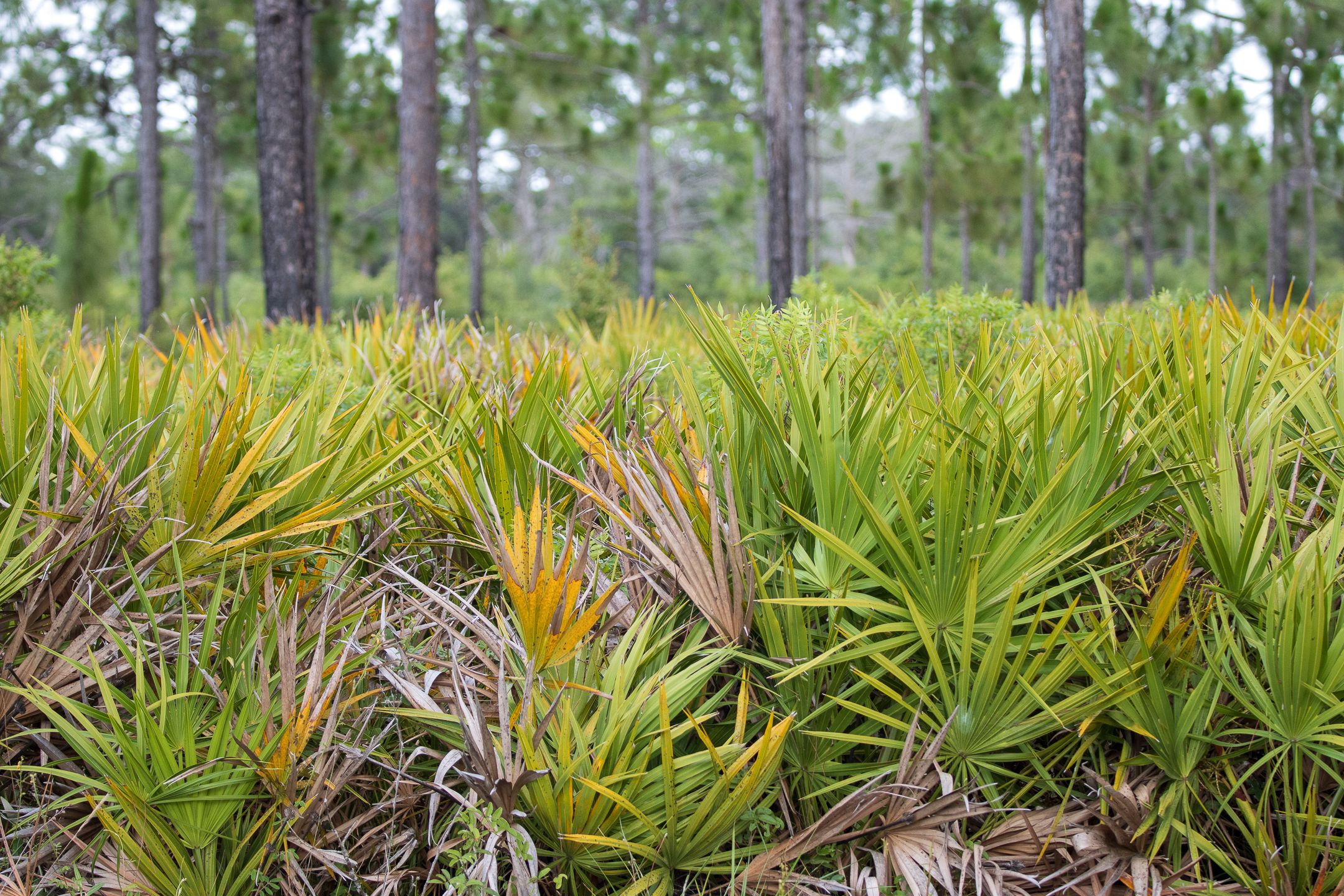 Saw palmetto is an evergreen shrub found in scrub, pinelands, coastal hammocks, and dunes in all of Florida but mainland Monroe County. There are at least 311 recorded species that use saw palmetto, while many other species have documented interlocking relationships with the plant. It is extremely valuable to hundreds of species of birds, mammals, and insects as a source of food and cover. Its flowers are a major source of nectar for honeybees and its berries are a staple for the Florida black bear.