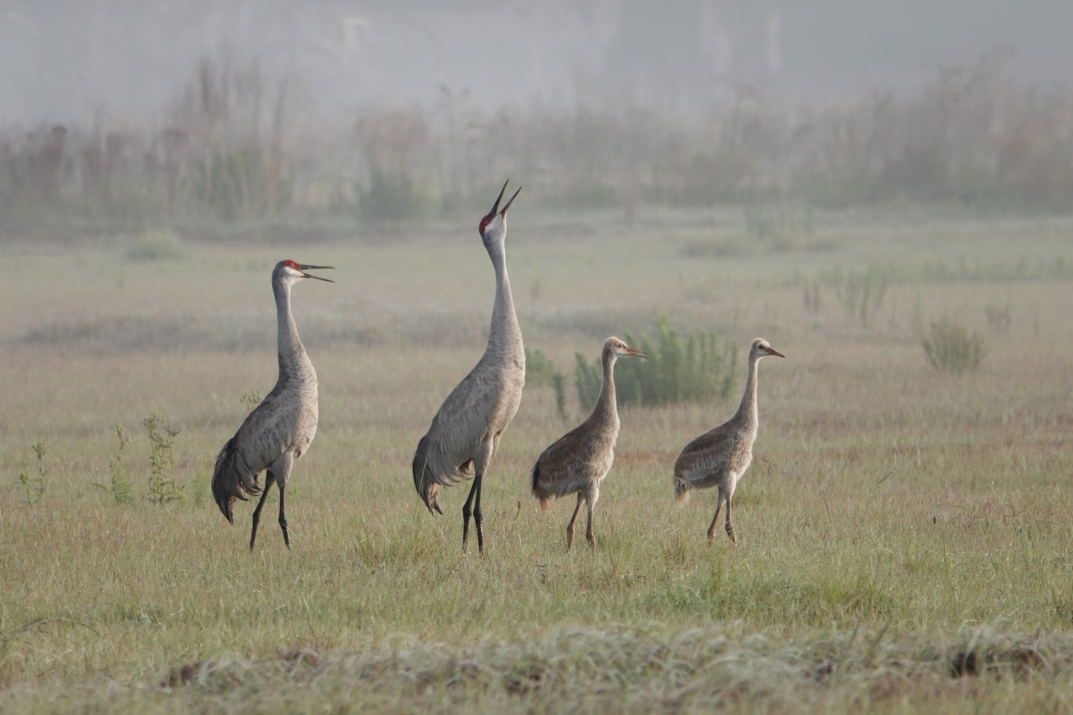 Sandhill cranes mate for life are usually seen in very small groups or pairs.