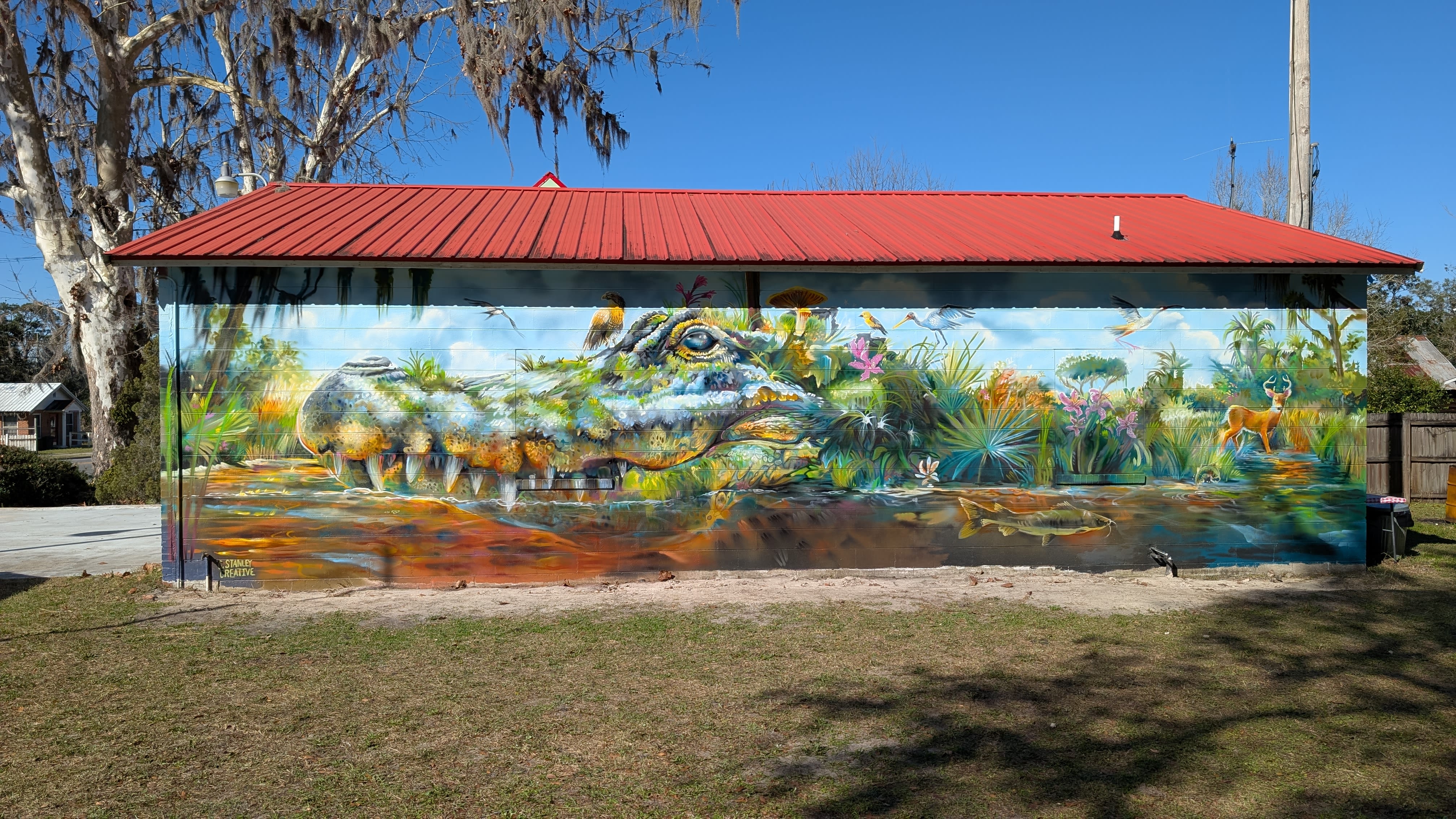 "Florida's Living Giant" by Christian Stanley showcases the diverse and vibrant ecosystem of North Florida through the striking image of a giant alligator head, reimagined as a lush, living landmass. The alligator, a keystone species, serves as a foundation for life, with its textured surface transformed into a thriving habitat. This mural is one of three Florida Wildlife Corridor Murals in White Springs meant to highlight Hamilton County's role as a Corridor Gateway Community.