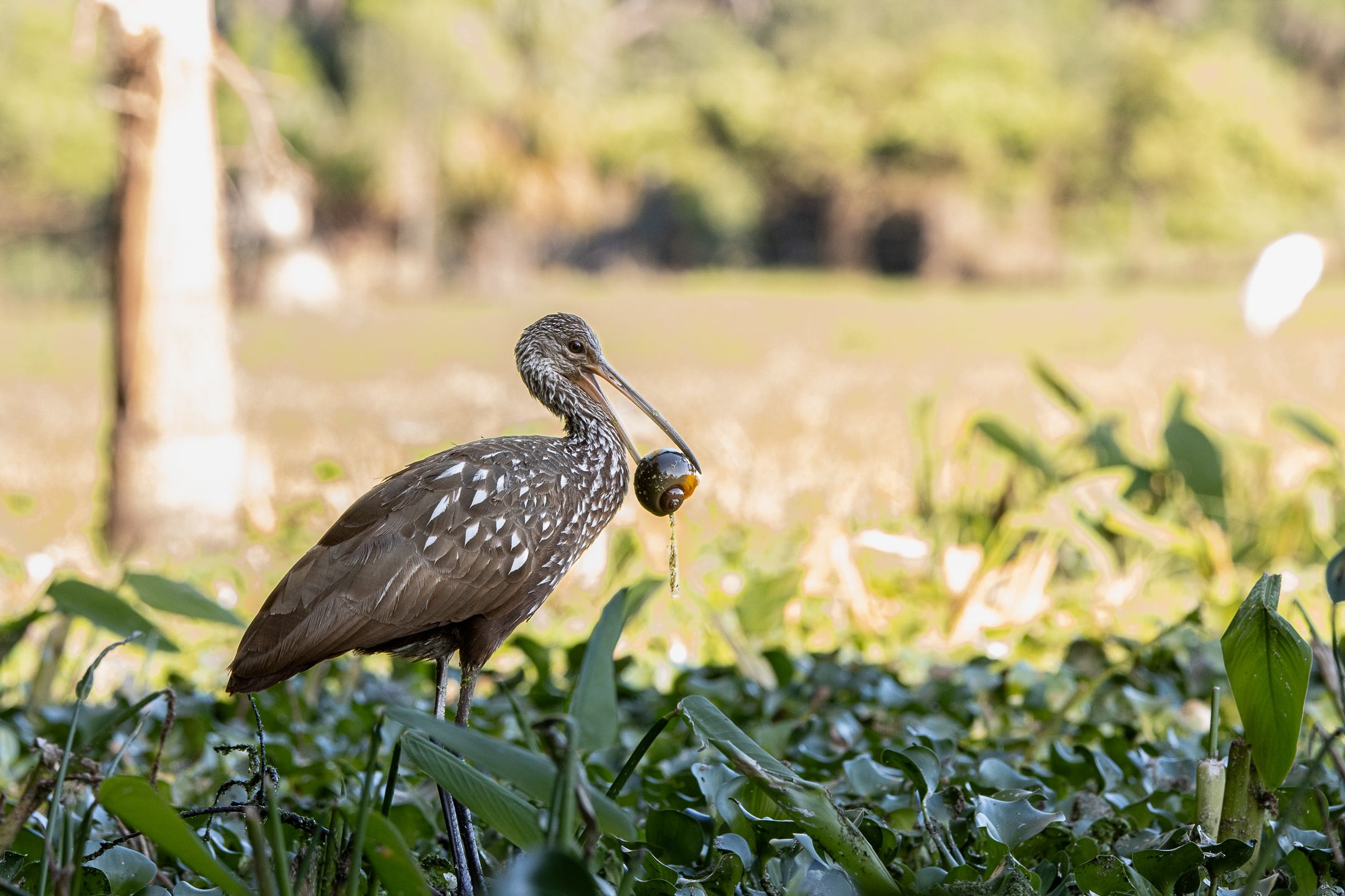 Limpkins feed primarily on apple snails, but they will also eat insects, worms, and mussels. Limpkins will walk in shallow waters searching for apple snails and utilize their down-curved bills to get the snail out of its shell.