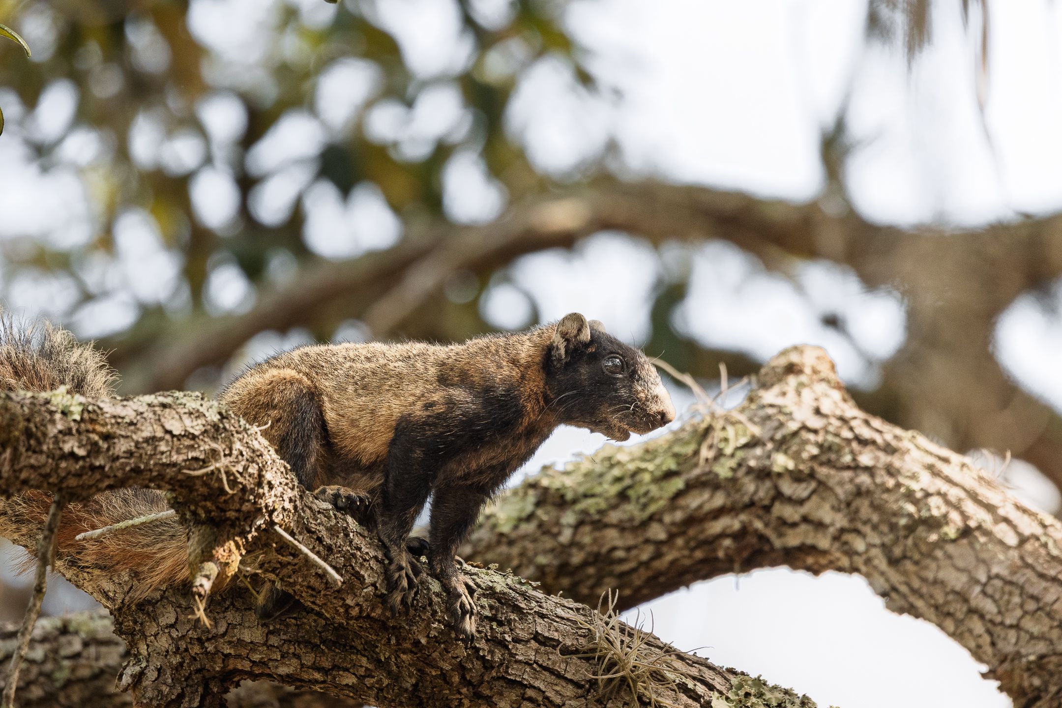 The southern fox squirrel, previously classified as Sherman's fox squirrel, is a large rodent known for their long bushy tails and their strong hind legs which enables them to leap far. It can reach a length up to 27 inches and a weight between one to three pounds. This species has an overall color that varies from black to brown with a black head, white ears, and a white snout.