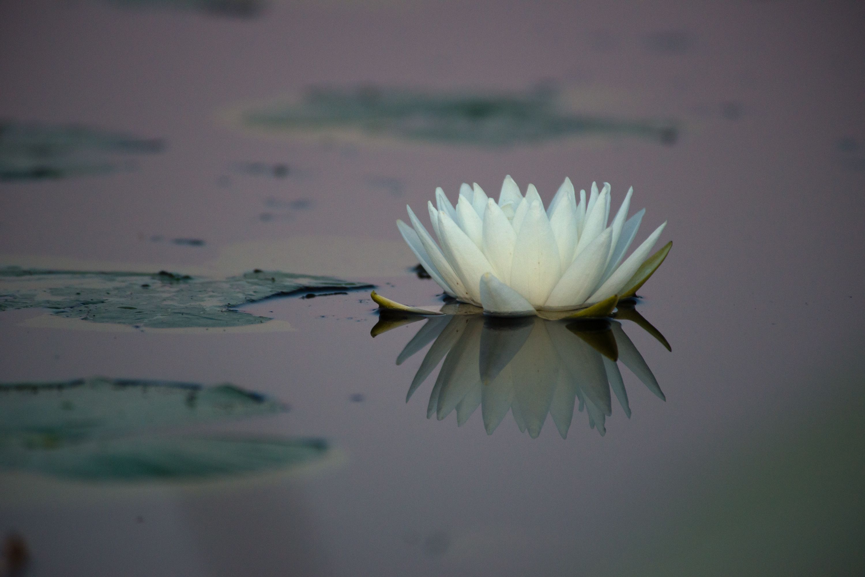 The white water lily is recognized by its large, floating, circular leaves and large, white flowers. The waxy leaves are up to 8 inches across with a narrow v-shaped cleft where the stem attaches. The underside of the leaf is green or reddish-purple in color. The flower can be up to 5 inches wide with numerous white petals and is attached to a separate stem from the leaf. Forty or more yellow stamens surround a central ovary and disk-shaped stigma.