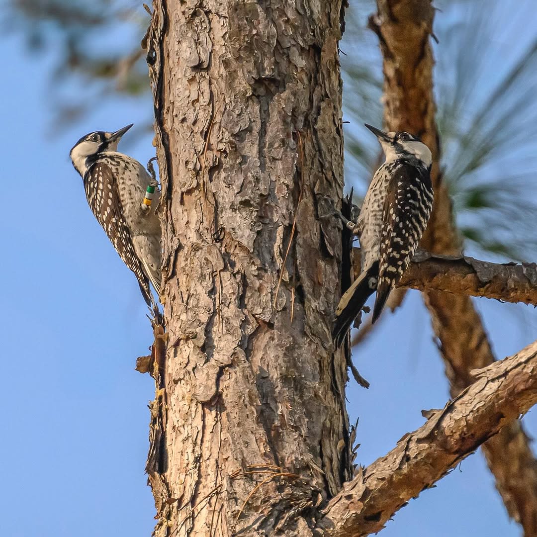 RCWs are unique in their nesting, as they only nest in self-made cavities in live, old-growth pine trees, as opposed to dead trees which most woodpeckers prefer. In Florida, RCWs inhabit old growth slash, longleaf, and loblolly pines. Because of the loss of old growth pine forests due to development, the RCW is federally and state listed as an endangered species.