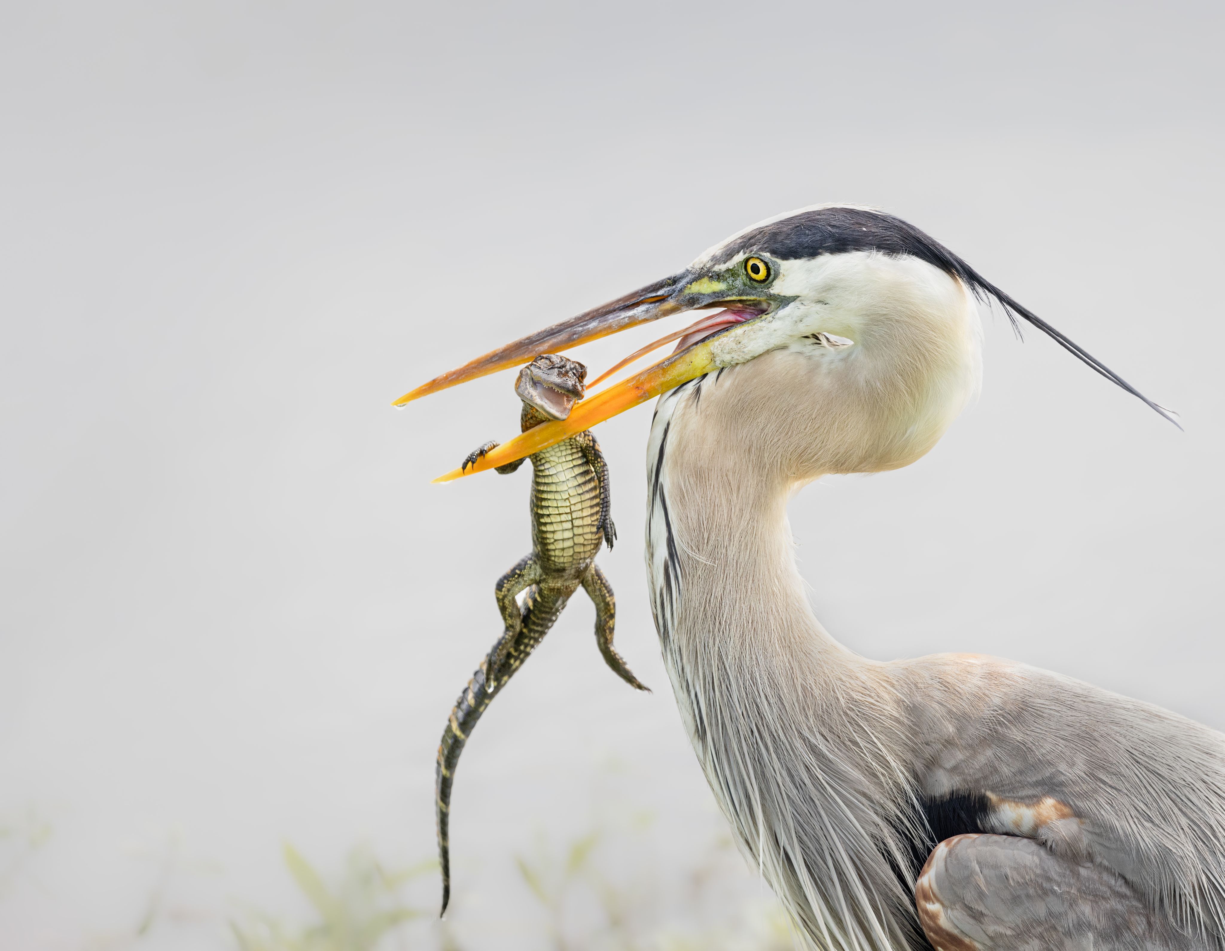 When foraging, Great Blue Herons exploit all types of wetlands and, occasionally, even upland habitats. They feed on a variety of prey, including fish, insects, crustaceans, amphibians, snakes, young birds, and rodents.