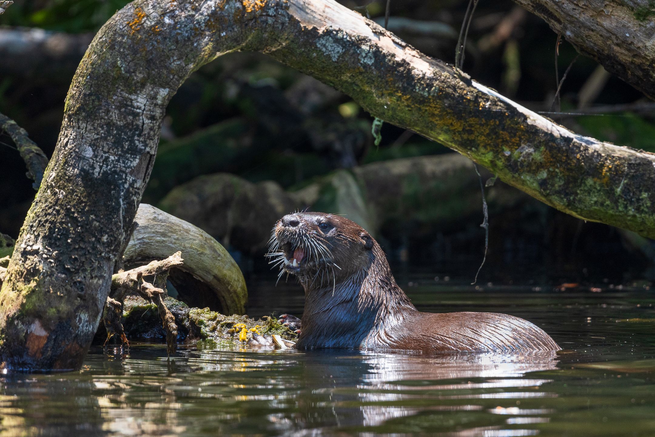 This water-loving animal is found throughout Florida except the Keys. North American river otters usually prefer fresh water and can be found in springs, rivers, creeks, lakes, ponds, and swamps. Otters live in burrows on the bank of the water body, often under tree roots. They may dig their own burrow or remodel a beaver’s burrow.
