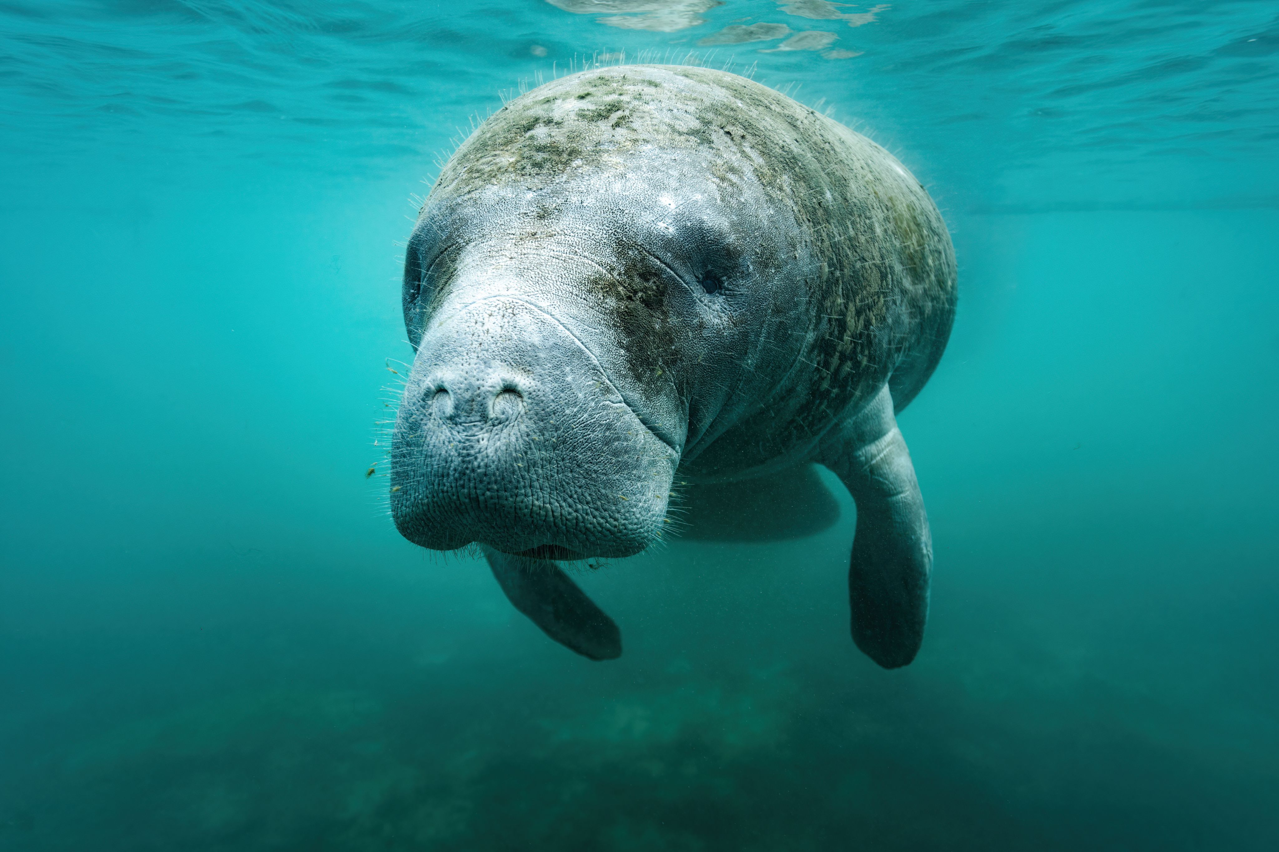 The Florida manatee is a subspecies of the West Indian manatee that lives in and is native to Florida. Florida manatees are large, gray, aquatic mammals. Adult manatees are typically 9-10 feet long from snout to tail and weigh around 1,000 pounds.