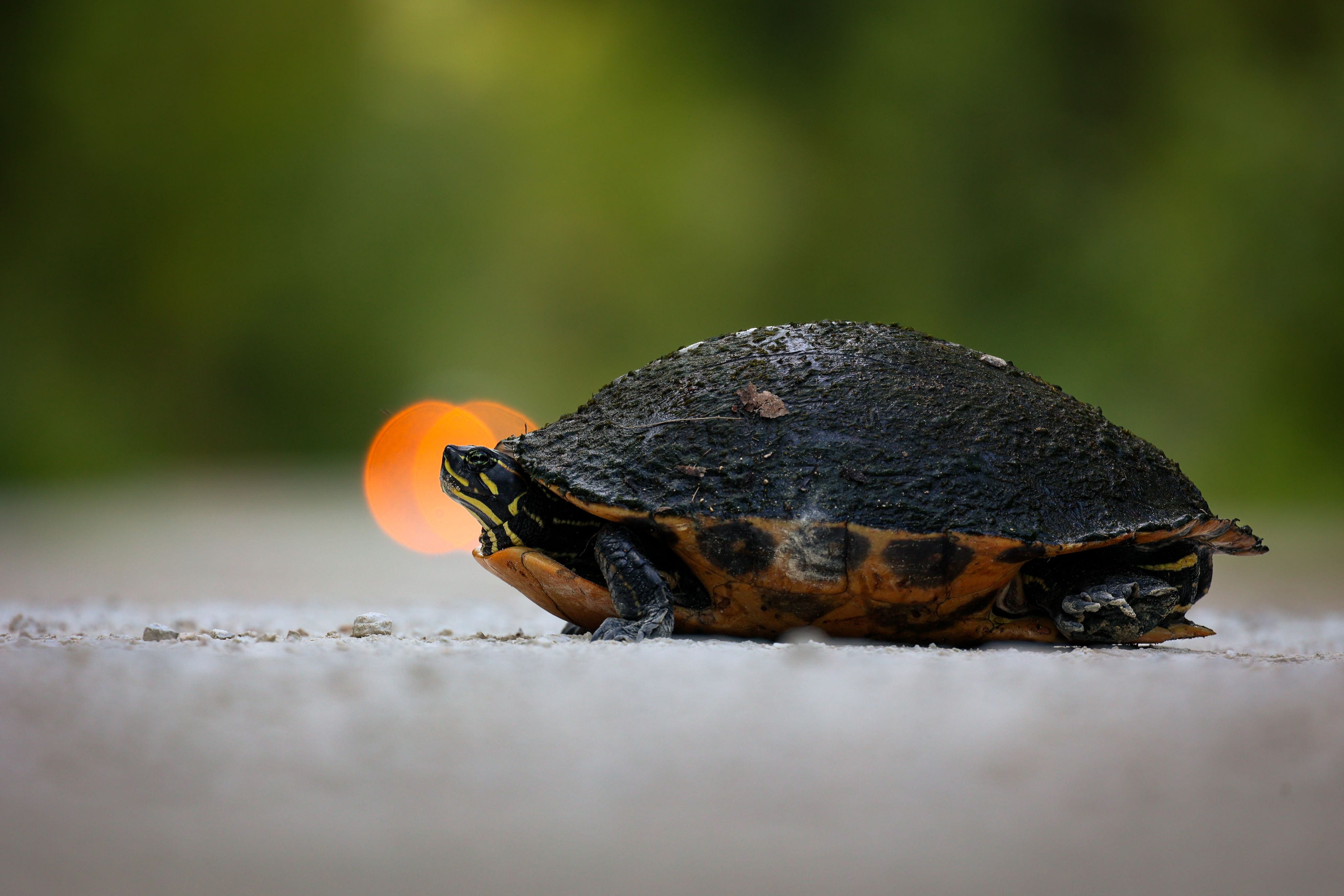 The red-bellied cooter shell is black and highly domed with reddish to yellow-orange vertical stripes on each scale. The belly is yellow orange to reddish. Adult size ranges from 8-12 inches with a maximum shell length of 14.8 inches.