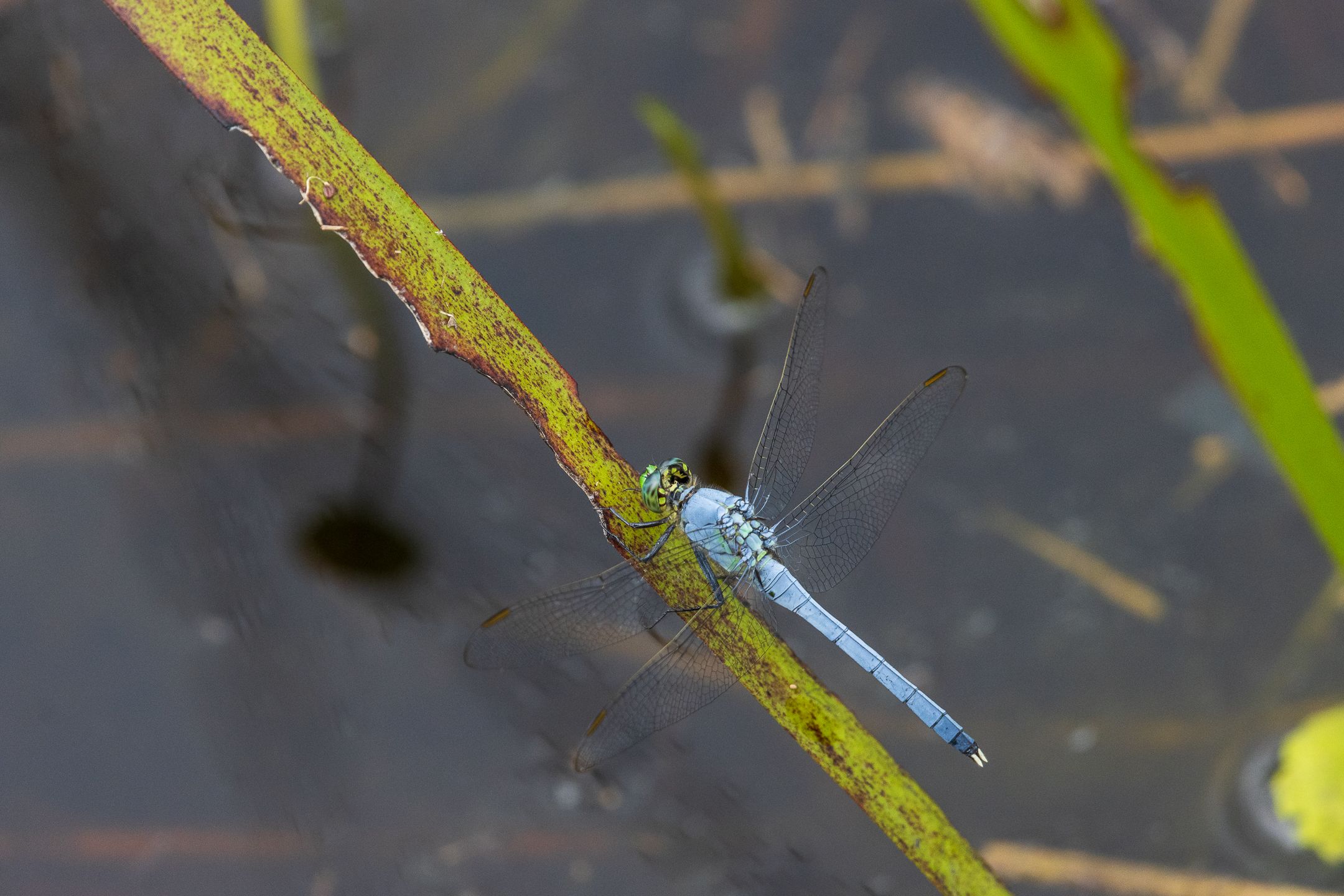 The eastern pondhawk is a swift and aggressive dragonfly of ponds and still waters. It is in the large family of dragonflies called skimmers. The species is distinguished in that the female is bright green with a banded abdomen and the mature male has a blue abdomen with a green face and green and blue thorax.