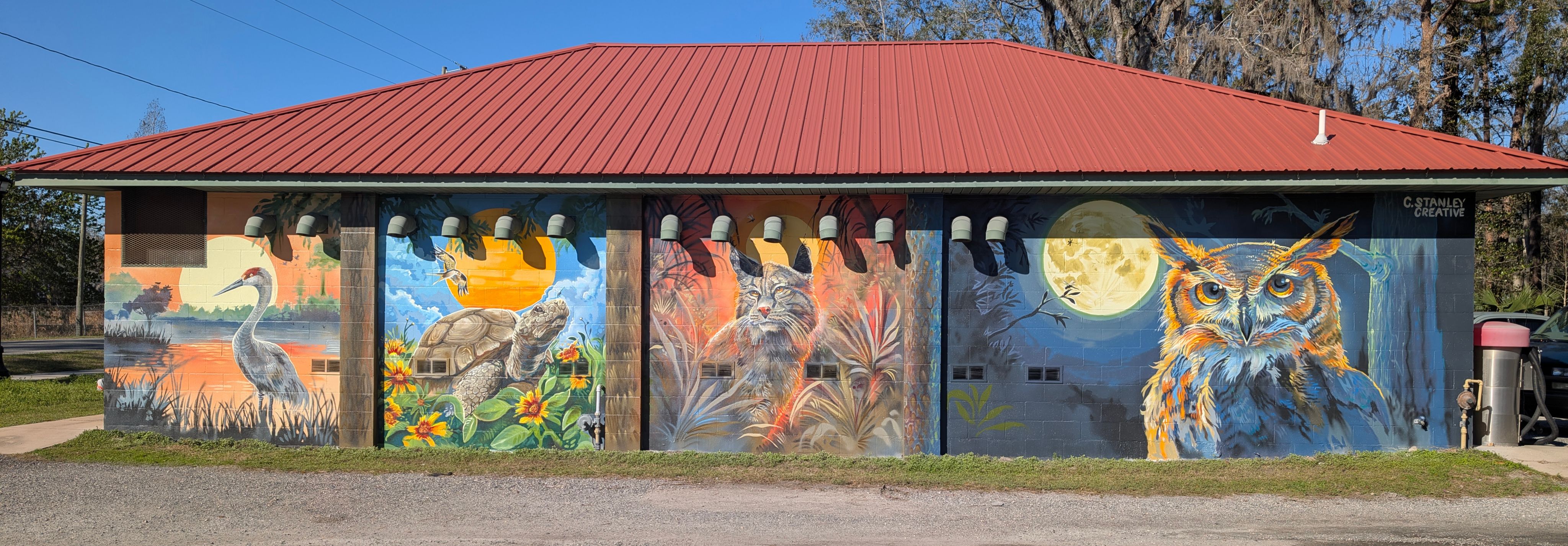 "Natures Rhythm" by Christian Stanley showcases the native flora and fauna of that can be found across different habitats in Hamilton County at different times of the day. This mural is one of three Florida Wildlife Corridor Murals in White Springs meant to highlight Hamilton County's role as a Corridor Gateway Community.
