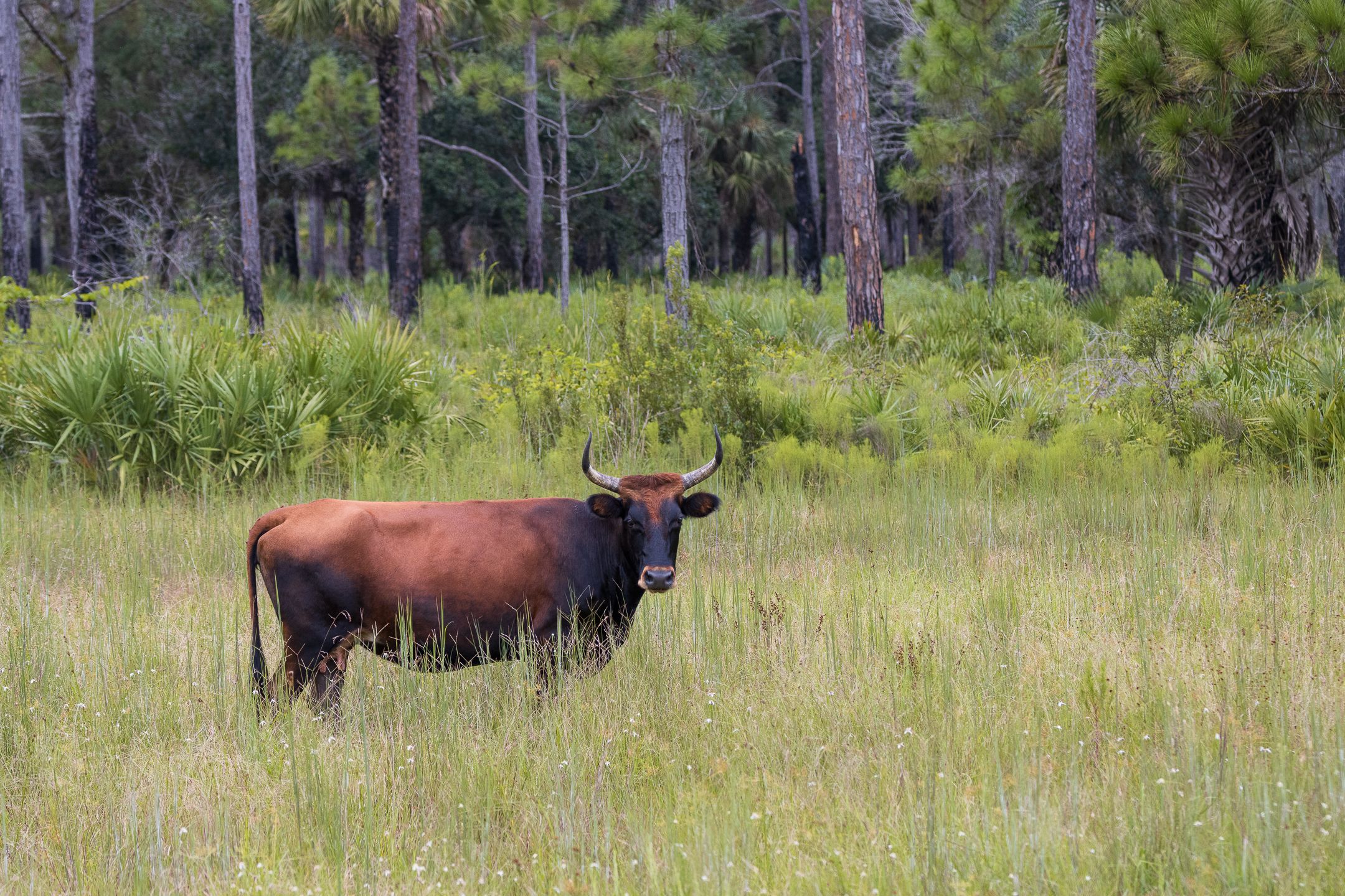 Cracker Cattle are known for their small to medium frame with a leaner body compared to commercial beef breeds, distinct horns that curve outward and slightly up, often display rich red, brown, or brindle coloring, and are adapted to Florida’s hot, humid, and rugged environment making them perfect for the states pine flatwoods and palmetto scrub.